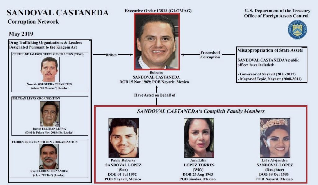 Sandoval Castañeda fue señalado por el gobierno de EEUU por apropiación indebida de bienes públicos y recibir sobornos del organizaciones del narcotráfico, incluido el CJNG.