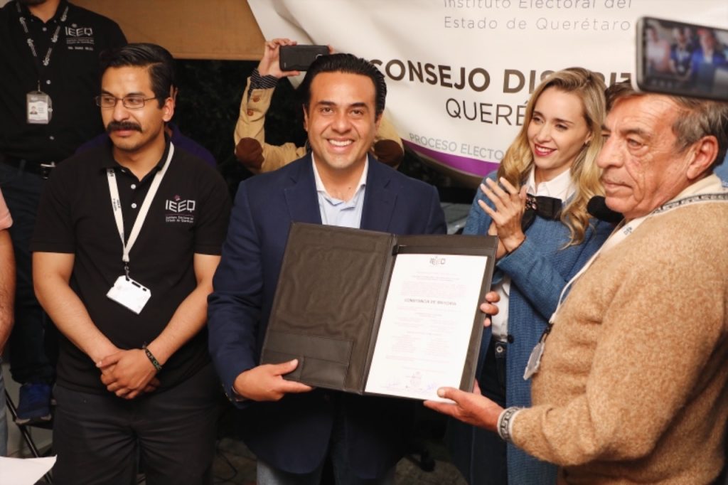 Tras realizarse la declaratoria de validez de la elección y publicarse el cómputo final en el exterior del Consejo Distrito 01 del Instituto Electoral de Querétaro, Nava Guerrero acudió a recibir la constancia de mayoría.