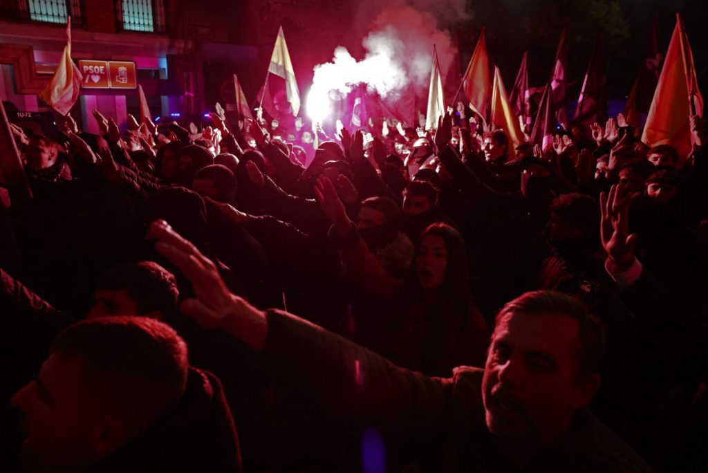 La manifestación recorrió desde la sede del Partido Popular (PP) hasta la del Partido Socialista Obrero Español (PSOE), bajo la consigna “Unidad nacional” y pancartas contra la inmigración.