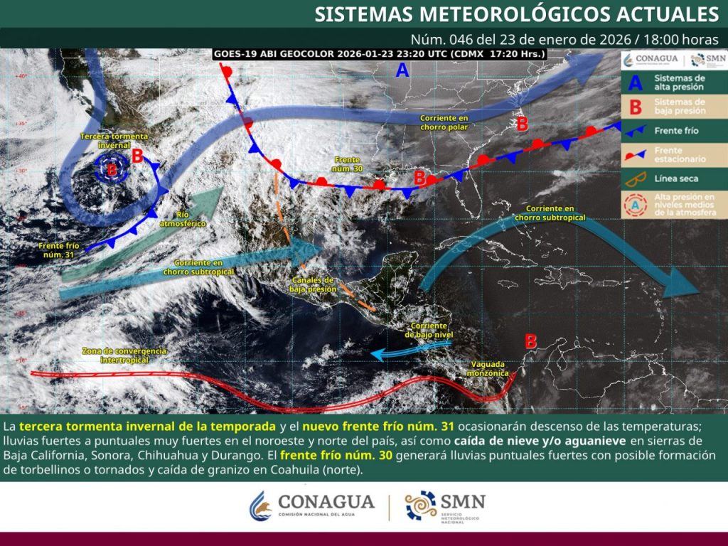 De acuerdo con el Servicio Meteorológico Nacional (SMN), la tormenta invernal “Fern”, en interacción con el frente frío número 31, un río atmosférico y las corrientes en chorro polar y subtropical, ocasionará descenso marcado de temperaturas, lluvias fuertes a muy fuertes, rachas intensas de viento y posible caída de nieve o aguanieve en el noroeste y norte del país .