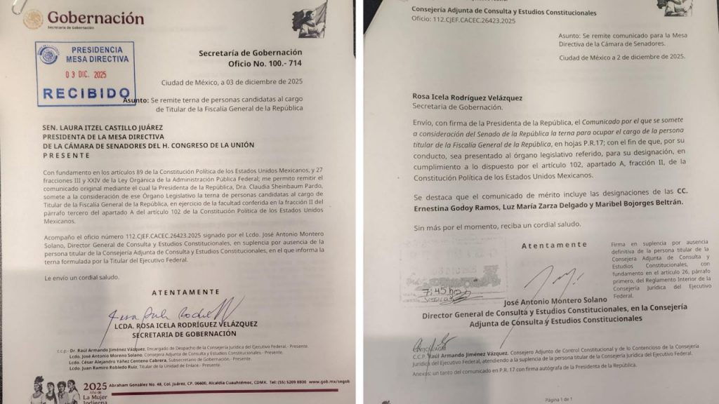 La presidenta del Senado de la República, Laura Itzel Castillo Juárez, informó que este órgano legislativo recibió de la presidenta de México, Claudia Sheinbaum Pardo, la terna de candidatas para ocupar la titularidad de la Fiscalía General de la República (FGR).