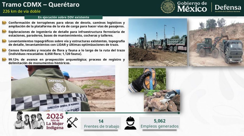 La Secretaría de la Defensa Nacional y la Agencia Reguladora de Transporte Ferroviario (ARTF) informaron que en conjunto, los proyectos ferroviarios México-Querétaro y México-Pachuca generarán alrededor de 260,000 empleos directos e indirectos este año.