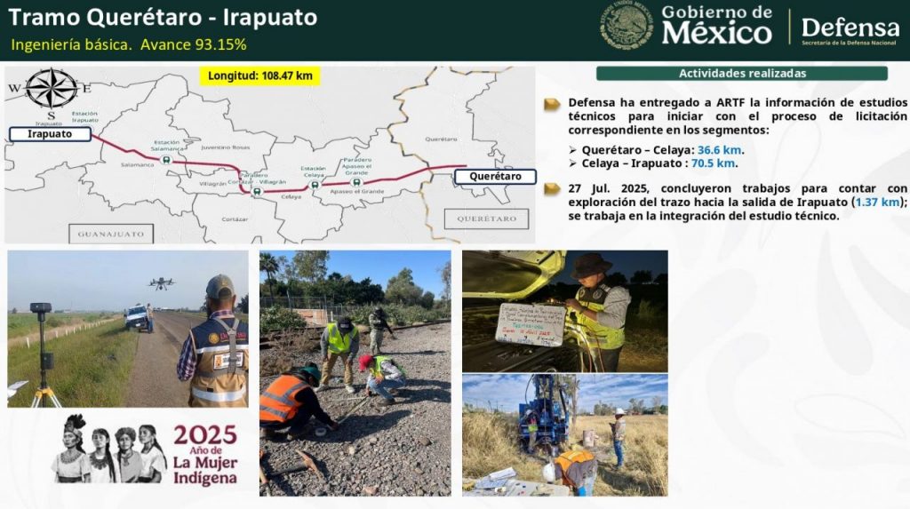 Para el tren Querétaro-Irapuato, el avance de la ingeniería básica es del 93%. La construcción se dividirá en dos tramos: de Querétaro a Apaseo el Grande, cuyo fallo de licitación se publicará el 18 de agosto, y de Apaseo el Grande a Irapuato, el 6 de octubre.