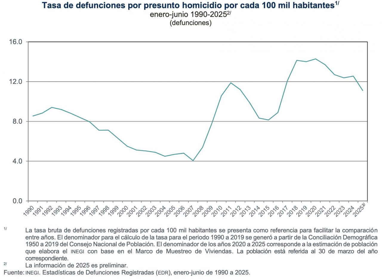 Esta tasa es inferior a la reportada en el primer semestre de 2024, cuando fue de 12.6 por cada 100 mil habitantes.