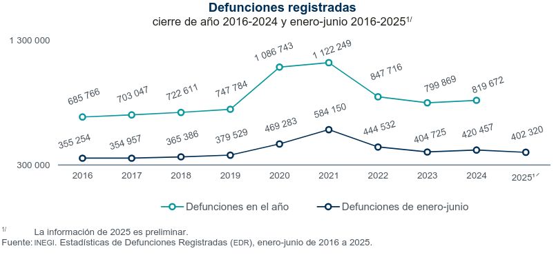 México registró 402,320 defunciones entre enero y junio de 2025, cifra 18,137 menor a la reportada en el mismo periodo de 2024, informó el Instituto Nacional de Estadística y Geografía (INEGI).