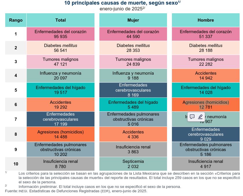 Las enfermedades del corazón, la diabetes mellitus y los tumores malignos se mantuvieron como las tres principales causas de muerte a nivel nacional. En conjunto, representaron casi una de cada tres defunciones ocurridas en el semestre.