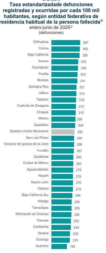 Las tasas más altas de mortalidad por cada 100 mil habitantes se concentraron en Chihuahua, Baja California y Colima, mientras que los niveles más bajos se registraron en Guerrero, Tlaxcala y Campeche, según los datos estandarizados por entidad.