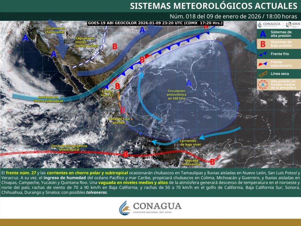 De acuerdo con el pronóstico, el sistema frontal recorrerá el Golfo de México e interaccionará con un canal de baja presión, generando lluvias intensas en Veracruz, Oaxaca, Chiapas y Tabasco, y chubascos con lluvias fuertes en la Sierra Gorda de Querétaro.