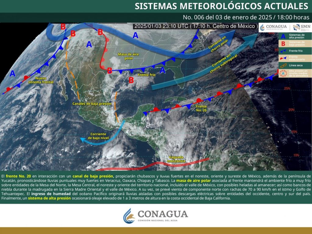 Se pronostican lluvias, nieve, aguanieve y lluvia engelante en Baja California, Sonora, Chihuahua, Durango, el noreste de Sinaloa, Zacatecas, Coahuila y Nuevo León.
