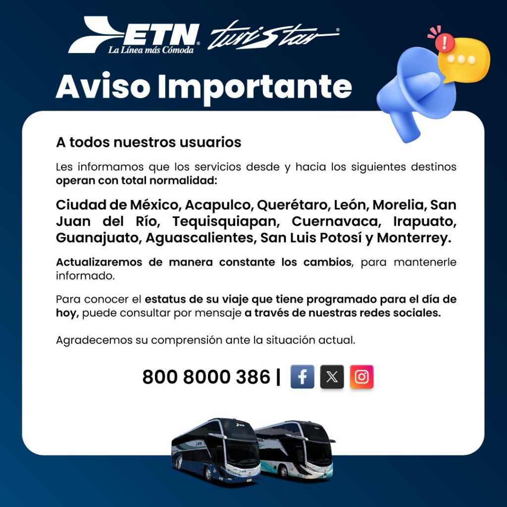Por su parte, ETN Turistar publicó en redes sociales que sus servicios “operan con total normalidad” hacia y desde destinos como Ciudad de México, Acapulco, Querétaro, León, Morelia, San Juan del Río, Tequisquiapan, Cuernavaca, Irapuato, Guanajuato, Aguascalientes, San Luis Potosí y Monterrey.