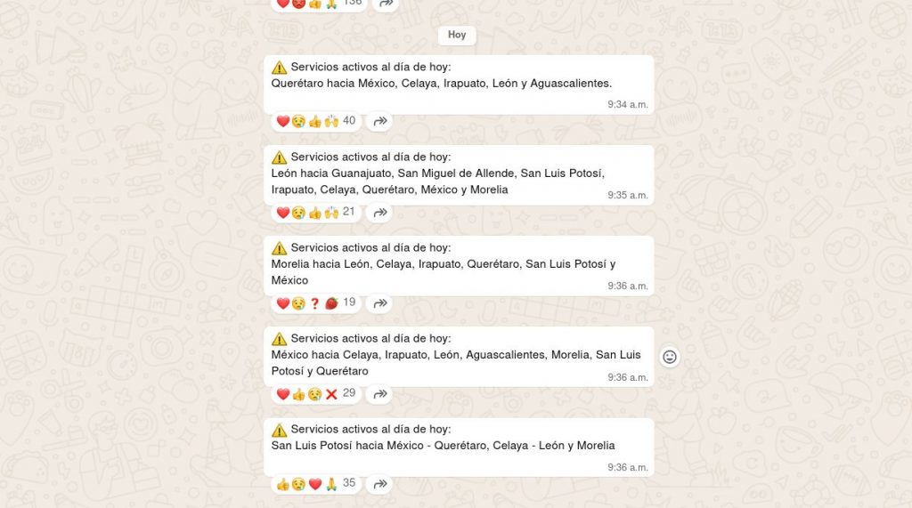 A través de su canal oficial de WhatsApp, Primera Plus notificó que se encuentran activos los servicios desde Querétaro hacia Ciudad de México, Celaya, Irapuato, León y Aguascalientes. También reportó salidas desde León hacia Guanajuato, San Miguel de Allende, San Luis Potosí, Irapuato, Celaya, Querétaro, Ciudad de México y Morelia.