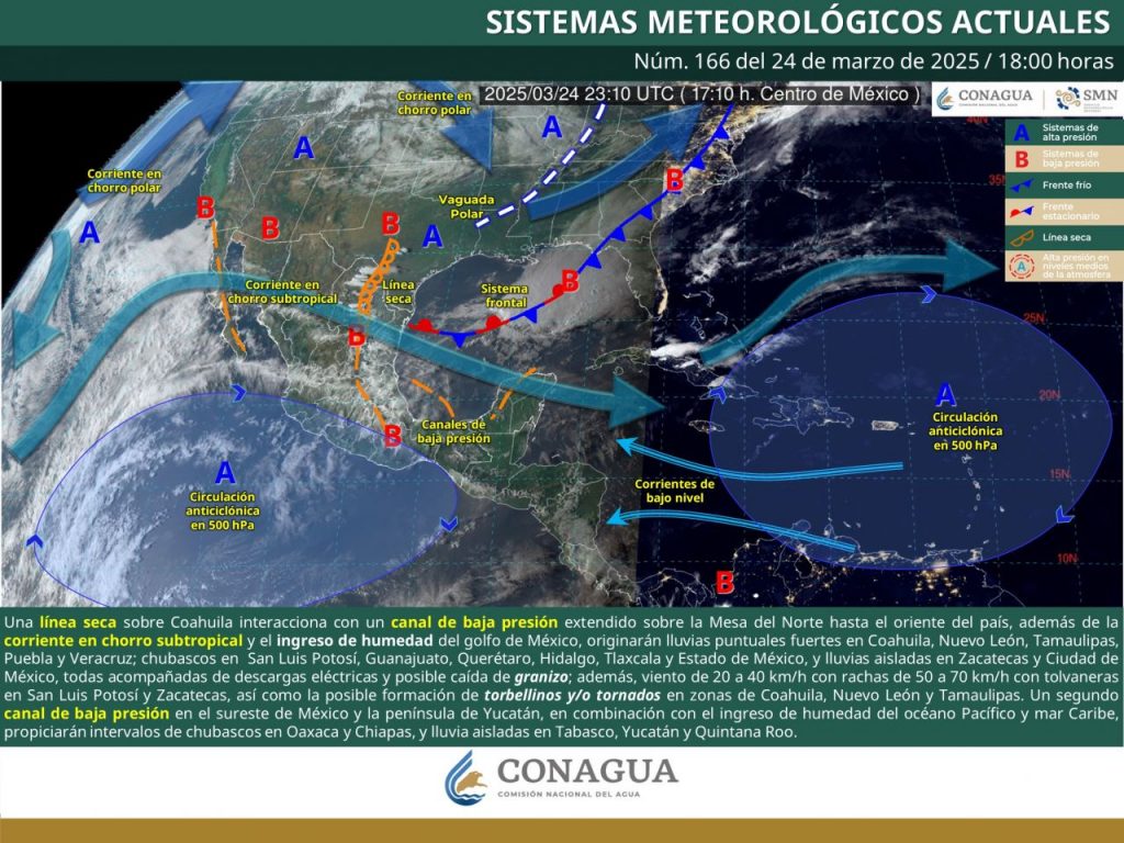 El Servicio Meteorológico Nacional (SMN) informó que durante la noche de este lunes 24 de marzo se prevén lluvias fuertes en Coahuila, Nuevo León, Tamaulipas, Puebla y Veracruz, acompañadas de descargas eléctricas y posible caída de granizo. Además, existe la probabilidad de formación de torbellinos o tornados en zonas del noreste.