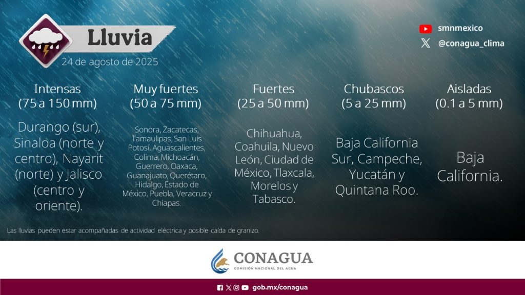 Además, se esperan lluvias muy fuertes de 50 a 75 milímetros en estados del centro y sur del país, entre ellos Zacatecas, San Luis Potosí, Guanajuato, Querétaro, Hidalgo, Estado de México, Puebla, Veracruz, Oaxaca y Chiapas.