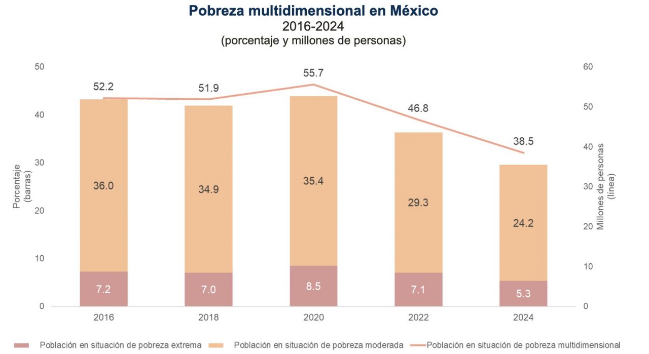 Entre 2016 y 2024, el porcentaje pasó de 43.2% a 29.6%. La pobreza extrema también mostró una baja: de 7.2% a 5.3% de la población.