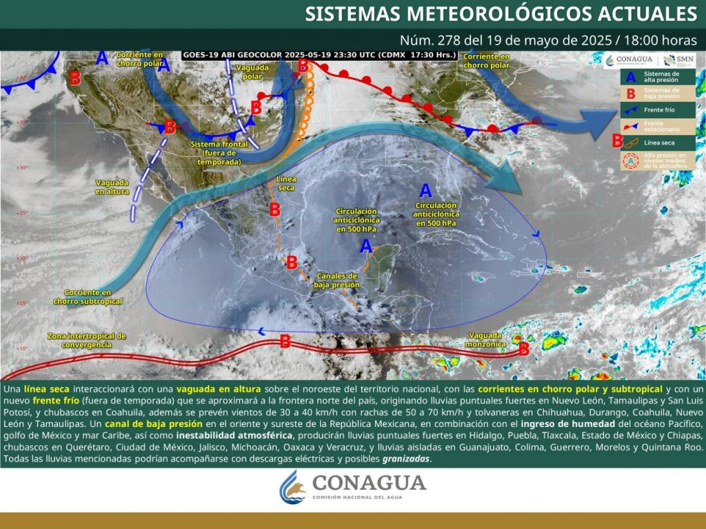 Durante esta noche y la madrugada del martes 20 de mayo, se prevén lluvias fuertes en al menos ocho estados del país, mientras que la onda de calor persistirá durante el martes, con temperaturas que podrían superar los 45 °C en regiones del norte, occidente y sureste de México.