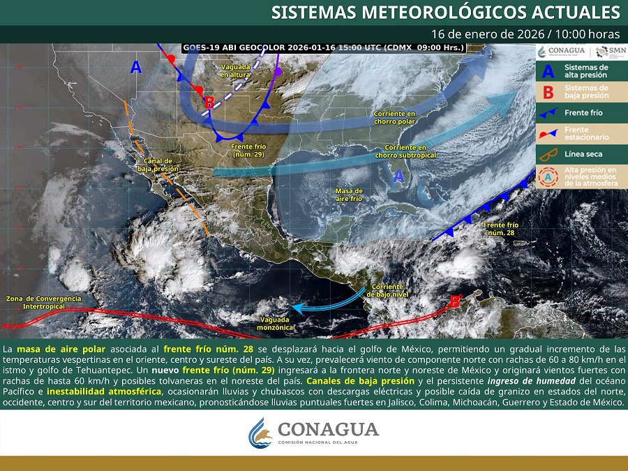 De acuerdo con el organismo, se prevén lluvias puntuales fuertes (de 25 a 50 mm) en Jalisco, Colima, Michoacán, Guerrero y Estado de México, mientras que Querétaro, Guanajuato, Hidalgo, Ciudad de México, Morelos, Tlaxcala y Puebla registrarán chubascos. Las precipitaciones podrían estar acompañadas de descargas eléctricas, encharcamientos e inundaciones en zonas bajas.