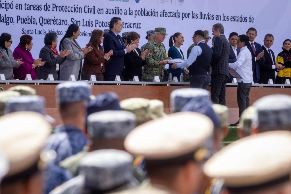 La presidenta Claudia Sheinbaum Pardo encabezó una ceremonia de reconocimiento al personal que participó en la aplicación de los planes DN-III-E y Marina, así como en acciones de la CFE, para atender a las poblaciones afectadas por las lluvias en Querétaro, Hidalgo, Puebla, Veracruz y San Luis Potosí.
