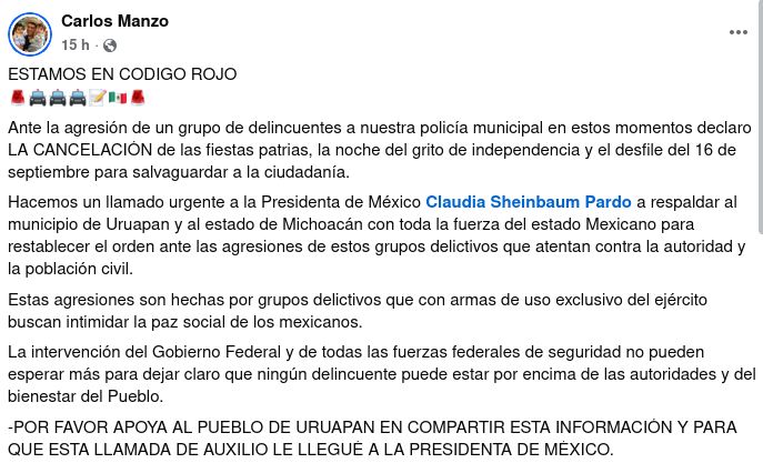 “La intervención del Gobierno Federal no puede esperar más”, afirmó Manzo, quien pidió apoyo urgente a la presidenta Claudia Sheinbaum para restablecer el orden.