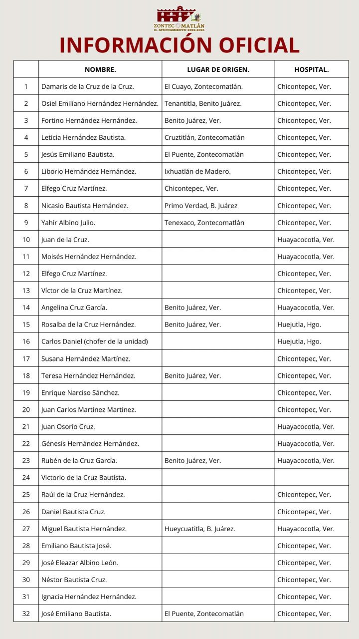 De acuerdo con el ayuntamiento, el percance ocurrió cerca de la cabecera municipal y dejó además a decenas de heridos, quienes fueron trasladados a hospitales de Chicontepec, Huayacocotla y Huejutla. En total, 32 personas fueron atendidas en distintos centros médicos, según el listado oficial difundido por el municipio.