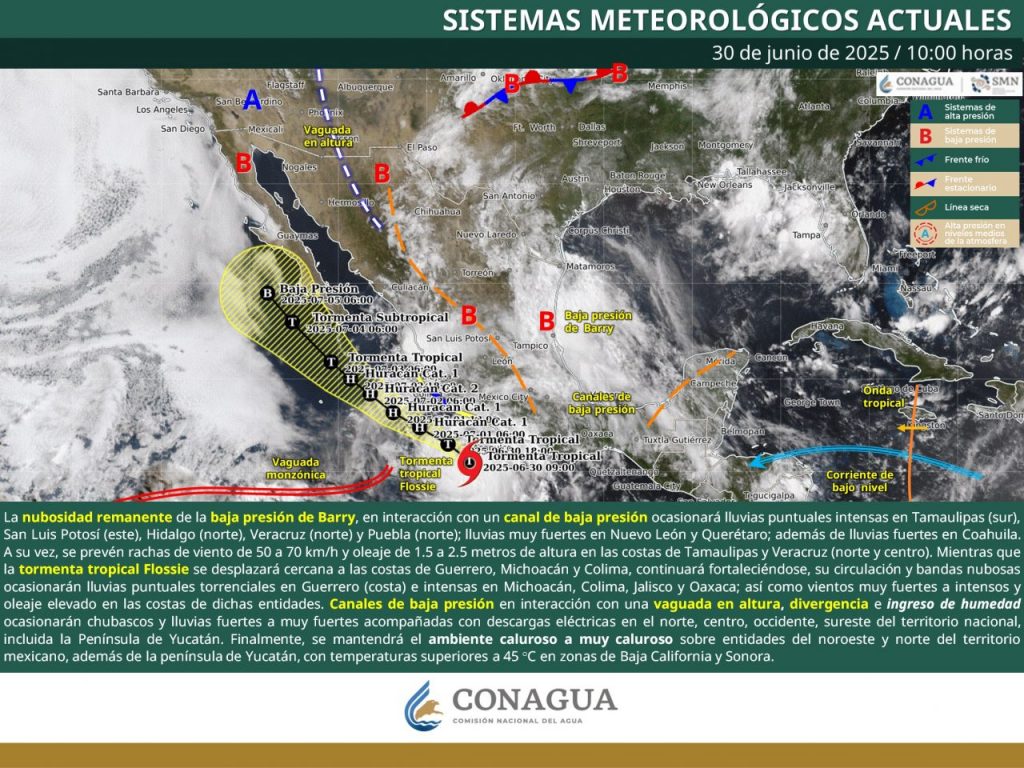 Las tormentas tropicales Flossie y Barry mantienen en alerta a varias regiones del país debido a las intensas lluvias, fuertes vientos y oleaje elevado que han comenzado a afectar las costas del Pacífico y el Golfo de México.