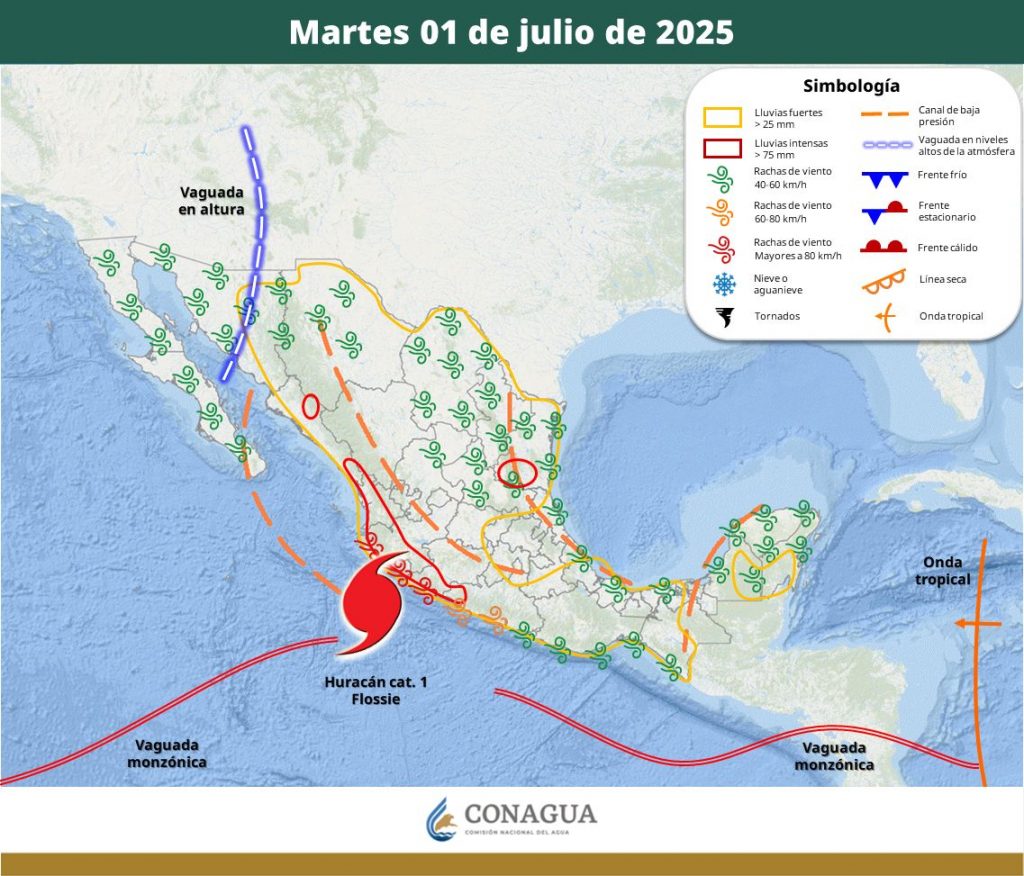 Flossie también generará vientos de hasta 130 km/h y oleaje de 5 a 6 metros en Michoacán, Colima y Jalisco, además de chubascos y lluvias intensas en estados del occidente, centro y norte del país como Jalisco, Oaxaca, Ciudad de México y Guanajuato. Se espera que evolucione a huracán categoría 1 en las próximas horas.