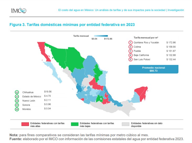 Las tarifas mensuales por metro cúbico de agua más altas del país se registraron en Quintana Roo, Colima, Puebla, Baja California y San Luis Potosí.