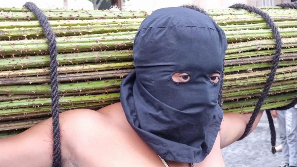 Mujeres penitentes amarran pesadas cadenas a sus pies descalzos y caminan encorvadas mientras llevan en las manos velas cuya cera cae directamente sobre su cuerpo.