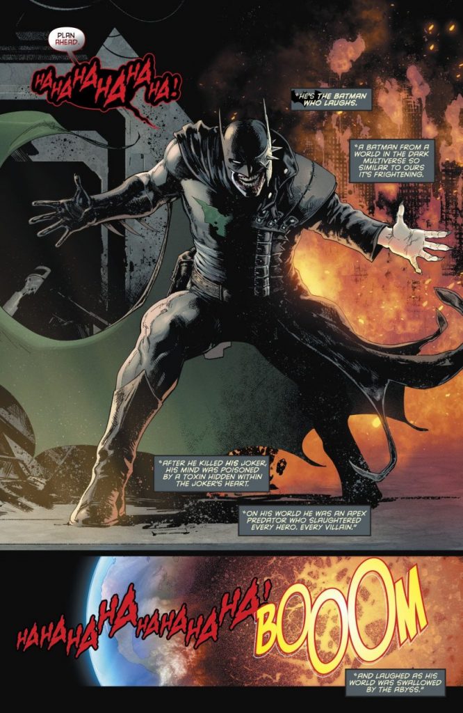 Tha Batman Who Laughs proviene de un universo alterno, en el que Batman asesina a Joker y es infectado por una toxina que emana del corazón del villano de la cara blanca, provocando una transformación y degradación total que lo convierte en un feroz depredador.