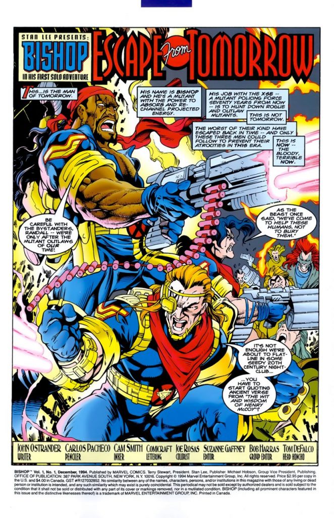 Ya hemos hablado del arribo de este personaje, ocurrido en las páginas de Uncanny X-Men #282 y #283, del 3 de septiembre y 1 de octubre de 1991, respectivamente. Durante algunos años, al mutante no se le dio primer nombre ni se sabía si Bishop era apodo, nombre o apellido.