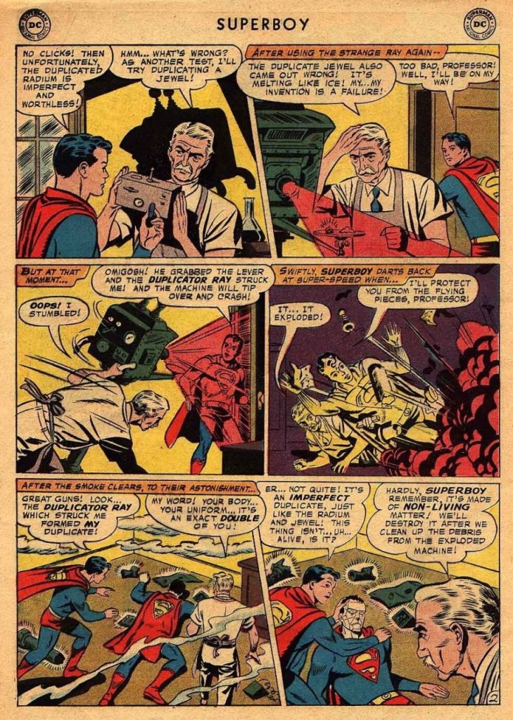 En esa primera aparición, Superboy observa la invención del profesor Dalton, un “rayo duplicador” de materia, mas el aparato no funciona como debe.