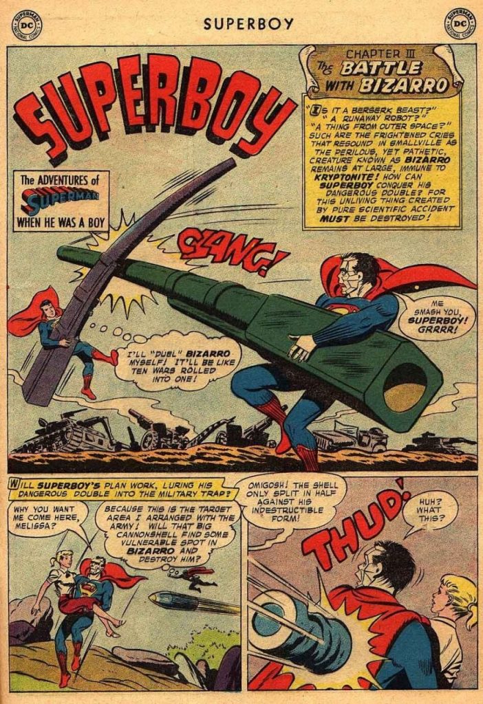 El 7 de enero de 1949, se estrenó el comic dedicado a Superboy y es bajo esta identidad que Clark Kent conoce a Bizarro, en una historia titulada “The Boy of Steel Versus the Thing of Steel” (“El niño de acero contra la cosa de acero”), por Binder y Papp. La portada es de Curt Swan, con tintas de Stan Kaye.