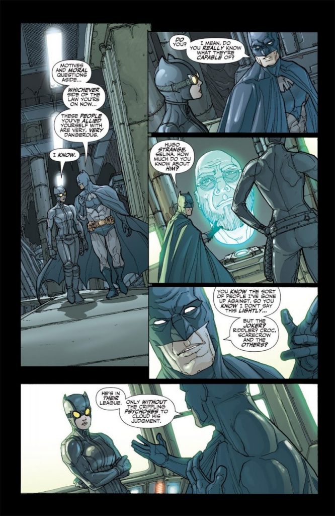 Otros actores se hacen presentes, como Captain Cold, Cheetah, Hugo Strange y, efectivamente, Batman, a quien vemos en el capítulo cinco (Catwoman #48).