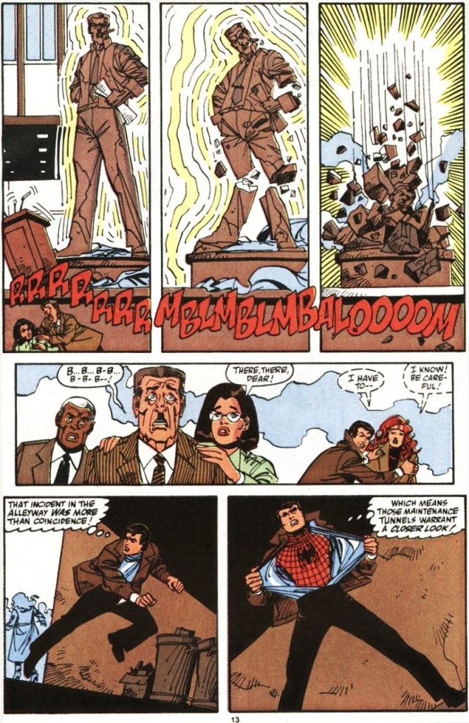 Por su parte, Peter decide investigar el fenómeno y cambia su identidad a la de Spider-Man. El héroe descubre escondida en los túneles subterráneos de mantenimiento, la maquinaria que provoca los temblores.