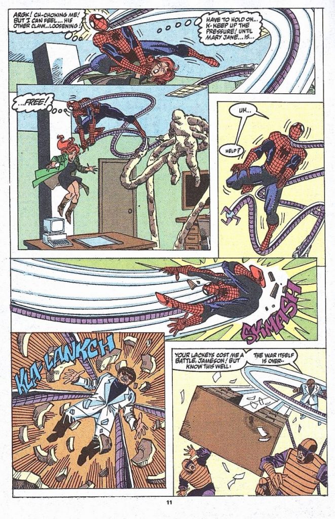 Octupus irrumpe secretamente en la celebración organizada por J. Jonah Jameson (y su esposa, Marla) para inaugurar las nuevas oficinas del Daily Bugle (que cuentan con una “hermosa” estatua de él mismo estacionada en la explanada frontal).