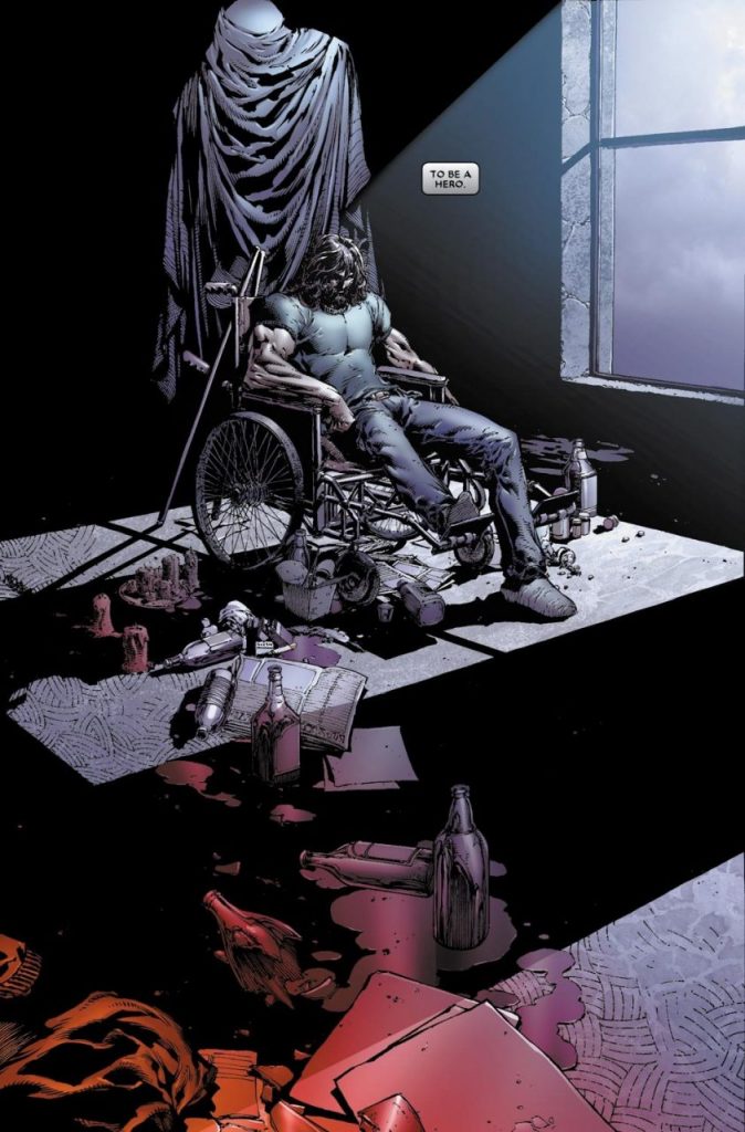En ese primer número, se nos presenta a Moon Knight como un héroe clásico de Marvel, optimista y con una vida establecida, apoyado por su aliado, Frenchie (vamos, su “Alfred”), y su amor, Marlene. No obstante, todo esto es una serie de recuerdos, pues Spector se encuentra en el peor estado físico y mental posible, en muletas y atado a botellas de alcohol y pastillas.
