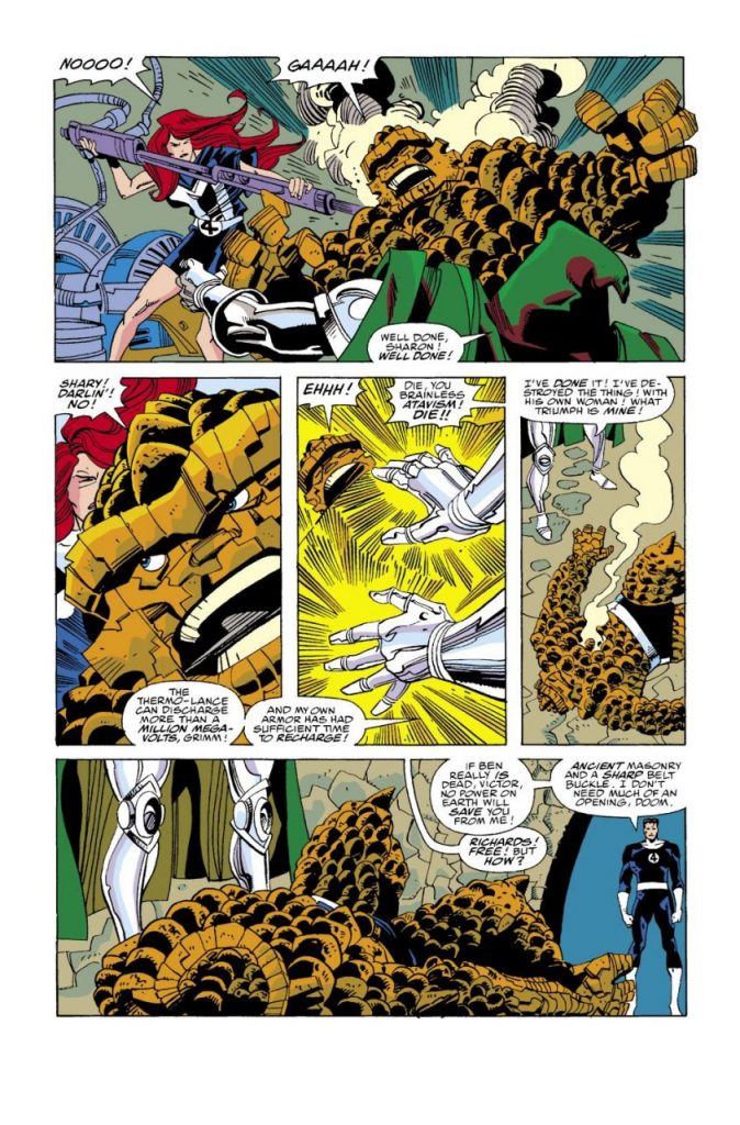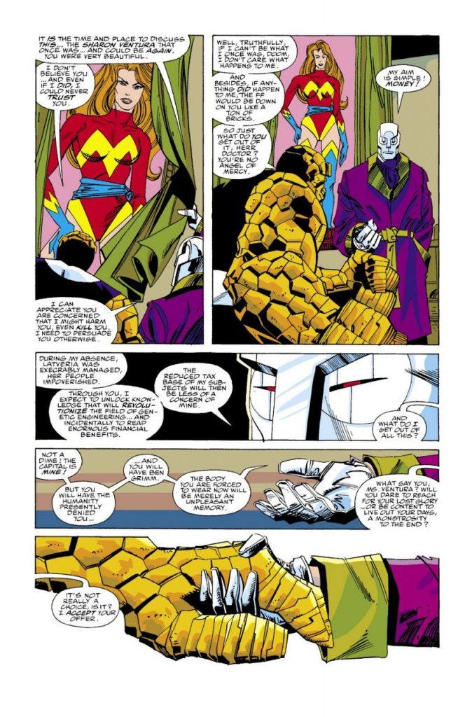 Una vez en Latveria, el cuarteto confronta a Doom y Ben recibe un nuevo baño radioactivo, recuperando su segunda mutación (que era conocida entre los lectores como “pineapple” o “piña”, debido a su parecido con la cáscara de esa fruta).