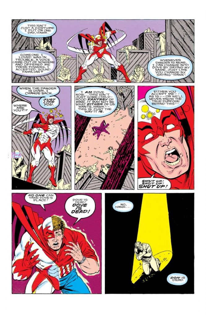 Cuando Hawk conoce a la nueva Dove, enfurece por tomar el lugar de su hermano y le reclama, asegurando que no puede existir otro Dove.