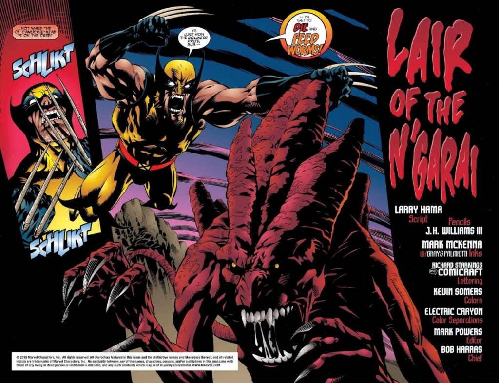 El relato principal, “Lair of the N’Garai” (“La guarida de los N’Garai”), fue escrito por el argumentista titular de Wolverine, Larry Hama, con arte de un novato J. H. Williams III, quien años más tarde sorprendería con su trabajo en comics como Promethea, Batwoman y Sandman: Overture; todos estos, para DC.