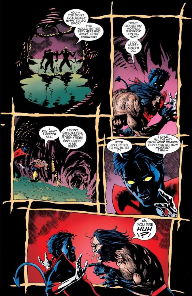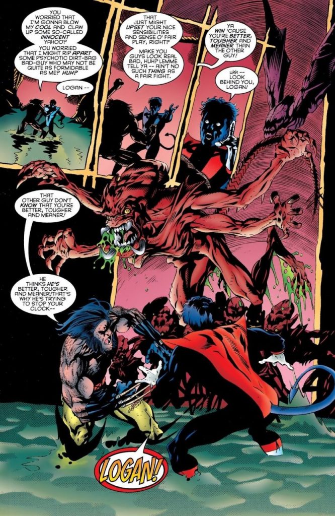 En el submundo, Logan deja salir su lado feral y ataca a cuanto demonio se le aparece. Solamente Kurt consigue mantenerlo cuerdo.