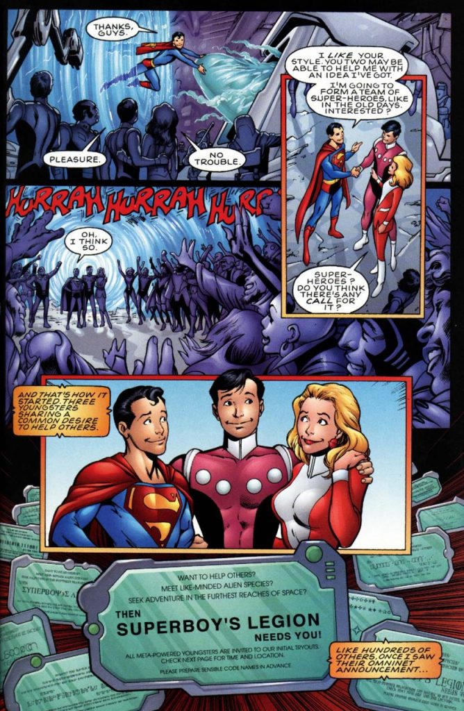 Después de ser rechazado en su petición para Green Lantern Corps, debido a su corta edad, Superboy funda a The Legion of Super-Heroes. Sus primeros reclutas son Saturn Girl y Cosmic Boy. Entonces, el trío lanza una convocatoria pública de candidatos (similar a la que se inscribe Superboy en la continuidad oficial).