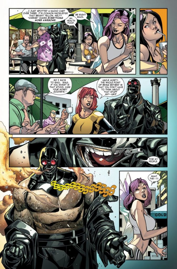 Cuando Jubilee va por comida, el enorme ser se presenta detrás de ella y, sin más aviso, explota. Ninguno de los presentes resulta herido, pero son bañados con sus restos.
