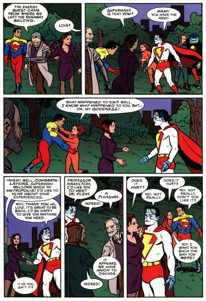 Cuando finalmente se encuentran (y se conocen), Frank y Superman regresan a sus respectivos cuerpos, aunque aún deben encontrar a los receptáculos del poder de Superman, que siguen repartidos en distintas personas, incluyendo Frank.