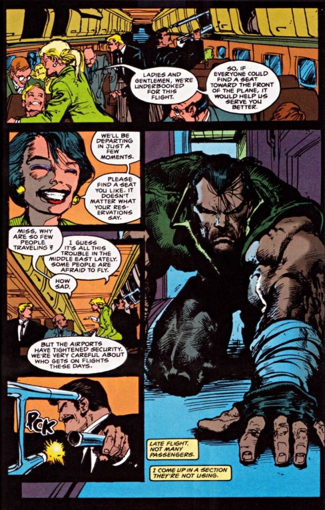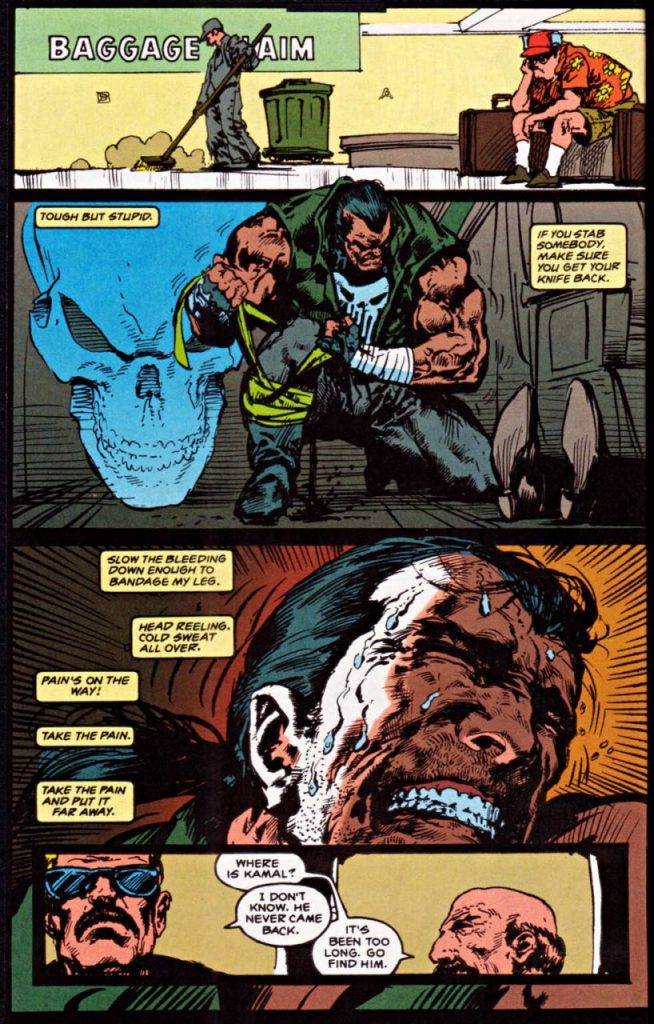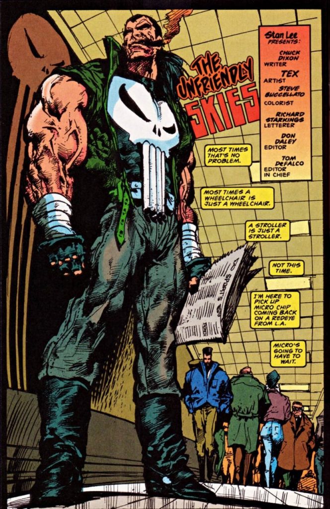 La narración es unitaria, así que no es el inicio de un arco ni su final; esto era común en Punisher, cuyas aventuras eran menos del tipo superheroico y más del tipo del vigilante urbano, tal como lo vemos en “The Unfriendly Skies” (“Los vientos hostiles”).
