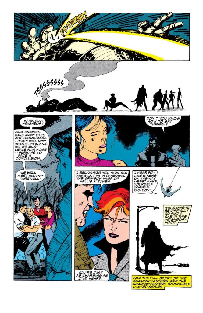 En la primera página, Lee nos entrega una gran ilustración de Black Widow quien ayuda, un tanto contra su voluntad, a Daredevil en un patrullaje. Murdock pide ayuda a Romanova para cuidar de los habitantes de un edificio, que han sido amedrentados para abandonar la vivienda. El motivo es vender el lugar para la construcción de condominios de lujo.