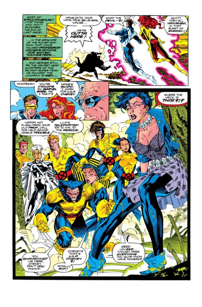 Las últimas cuatro páginas están dedicadas a mostrar lo que ha sucedido con el nuevo equipo de X-Men (Storm, Wolverine, Psylocke, Jubilee, Gambit, Banshee y Forge) cuando son teletransportados al espacio por Lila Cheney.