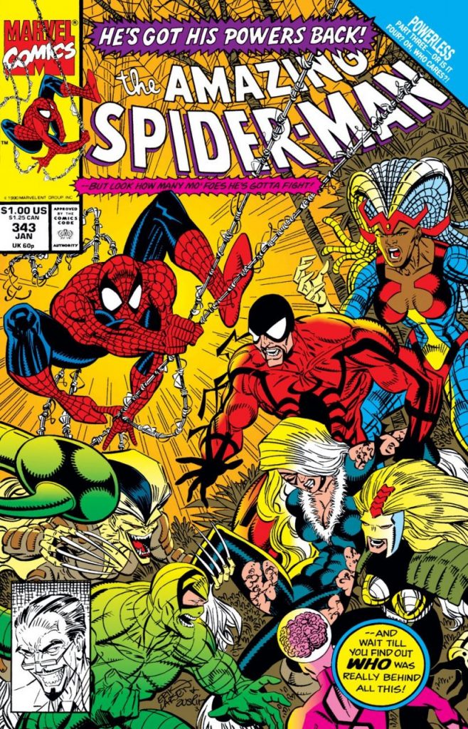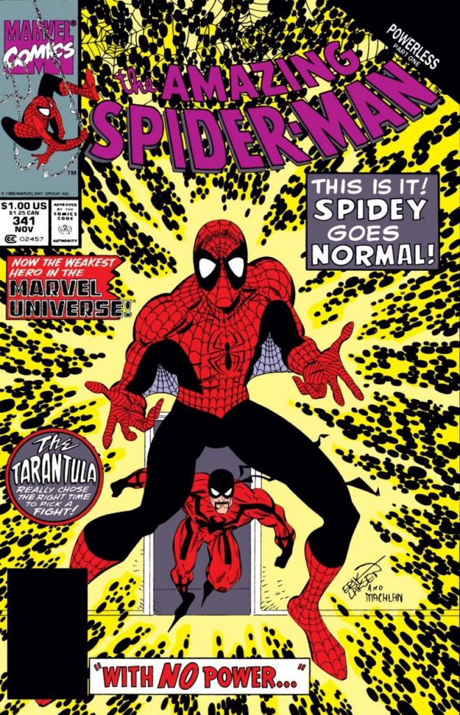 Uno de estos casos se dio en The Amazing Spider-Man #341, publicado el 11 de septiembre de 1990, donde inicia una pequeña saga de tres partes, titulada “Powerless” (sin poder), que fue escrita por David Michelinie, con arte a lápiz de Erik Larsen y tintas de Randy Emberlin.