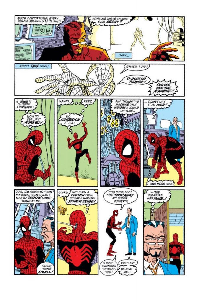 En el capítulo titulado “Sin gran poder…”, Spidey se somete a la máquina de Turner y sus poderes son extraídos por completo. Obviamente, los motivos de Turner no son del todo altruistas.