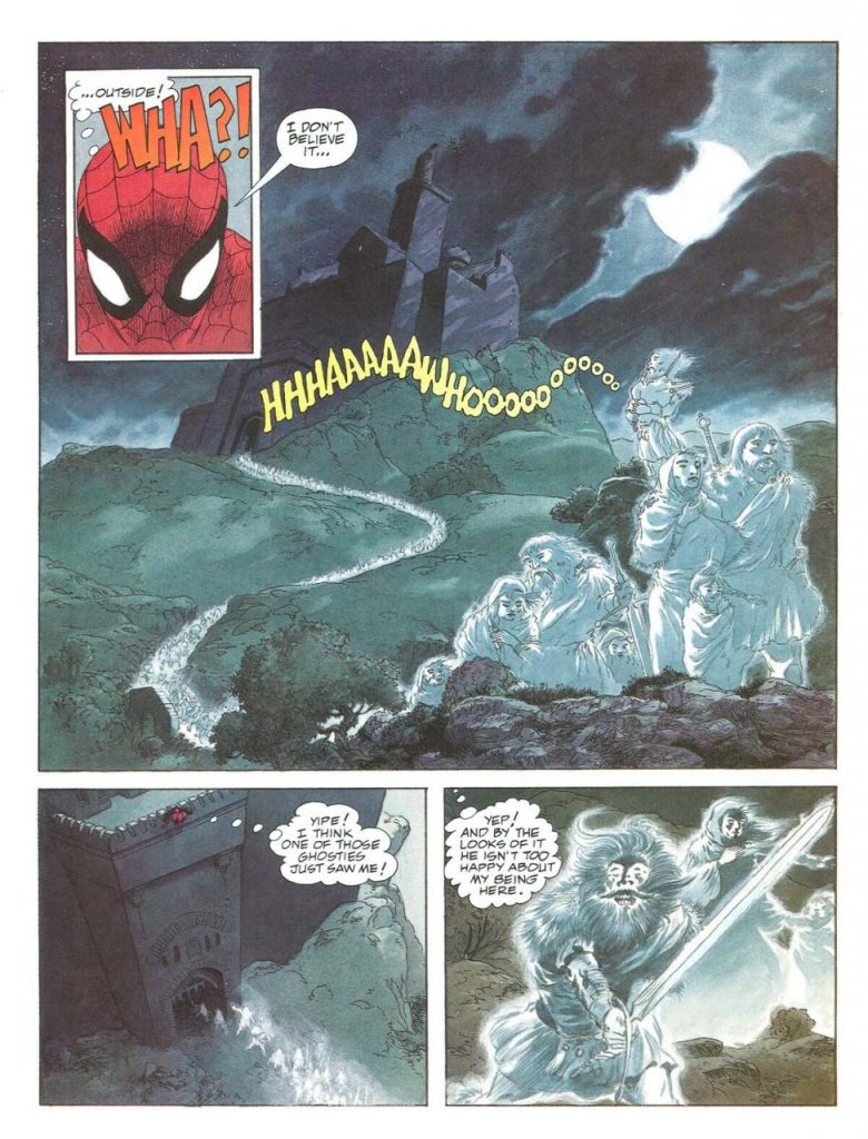 Como Spider-Man, Peter decide indagar un poco y, efectivamente, en un viejo castillo tiene un encuentro con algunos espíritus que, al percatarse de su presencia, lo atacan.