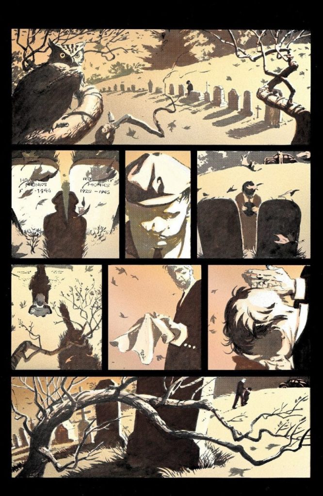 Todo inicia con un recuerdo (flashback), en el que un niño visita la tumba de sus padres, recordándonos un poco el caso de Bruce Wayne. La página es en color sepia con un sombreado especial.