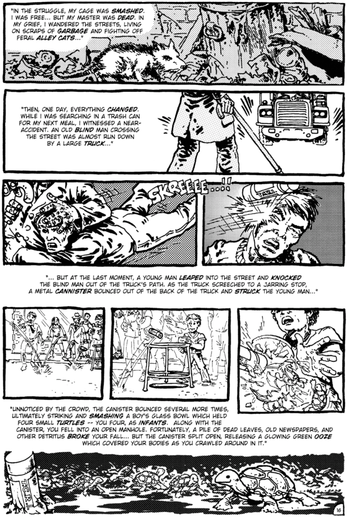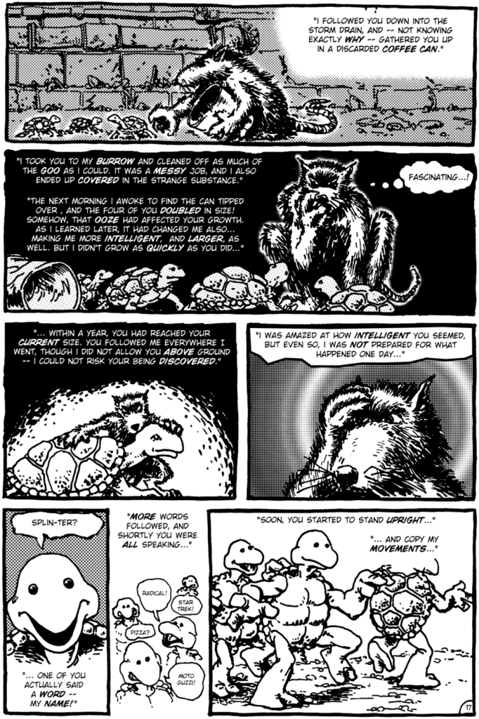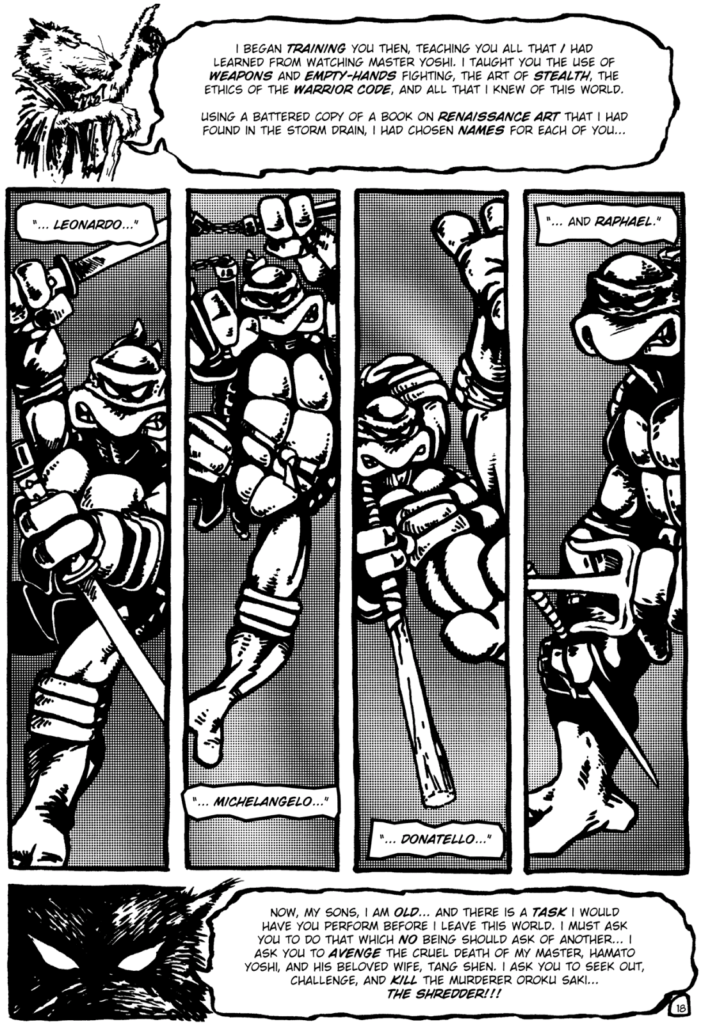 Al inicio, el comic de Las Tortugas Ninja era más parecido a sus inspiraciones, desde Cerebus hasta Ronin y eran considerablemente más violentos. Las narraciones eran similares a las que hacía Frank Miller en sus comics, donde se describe casi poéticamente el dolor físico y emocional de los involucrados.